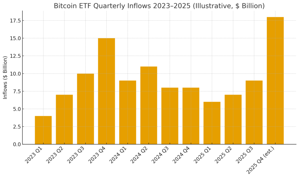 Insert here a chart/graph illustrating cumulative Bitcoin ETF inflows over time (2023–2025), and/or quarterly inflows.
