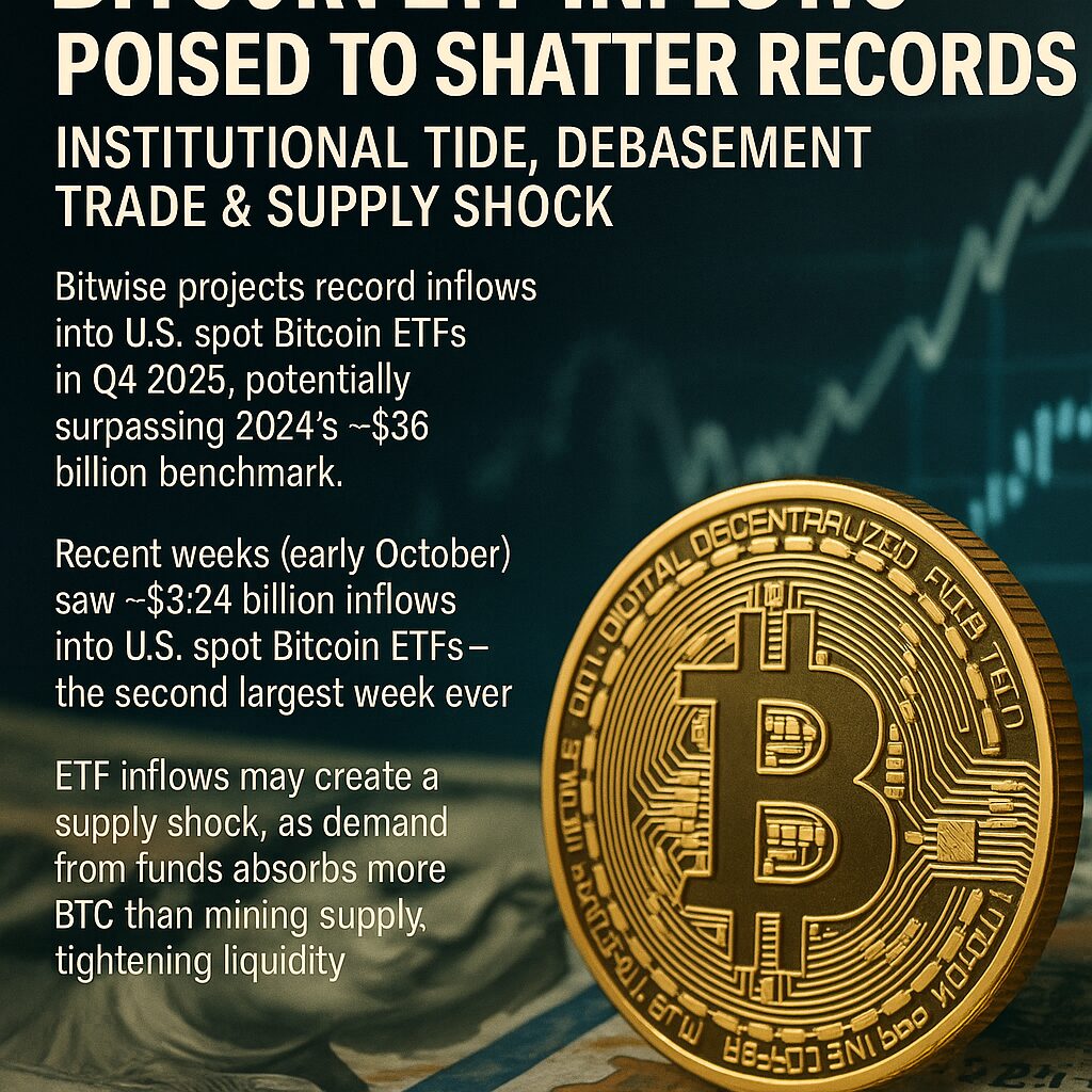 Bitwise’s prediction that Q4 2025 will bring record Bitcoin ETF inflows is not speculation in a vacuum—it’s supported by early inflow data, institutional policy shifts, macro tailwinds, and historical patterns. We’ve already seen ~$3.2+ billion flowing in a week, a large share to IBIT, signaling that capital is mobilizing.
