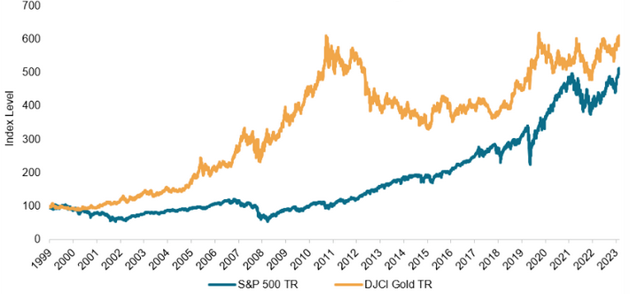 Line chart comparing gold, S&P 500, Nasdaq, and US Treasuries in USD terms.