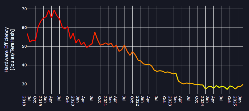 • Difficulty is rising, so the same hardware yields lower reward rates unless its efficiency improves.