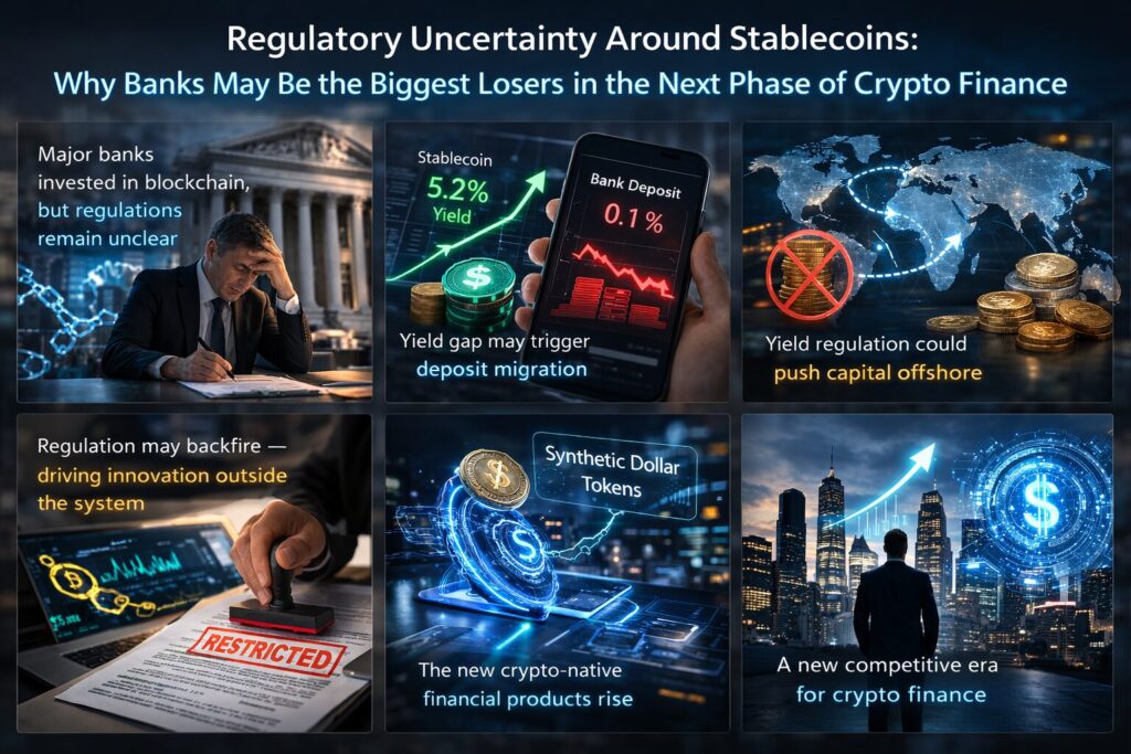 - Regulatory ambiguity around stablecoins may harm traditional banks more than crypto companies.