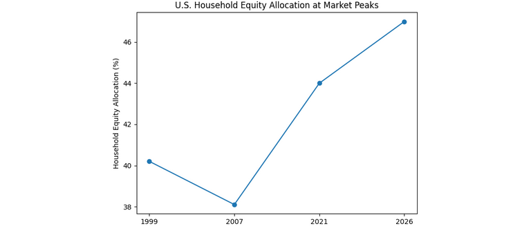 - U.S. household equity allocation has reached roughly 45–49%, exceeding dot-com and pre-2008 levels.