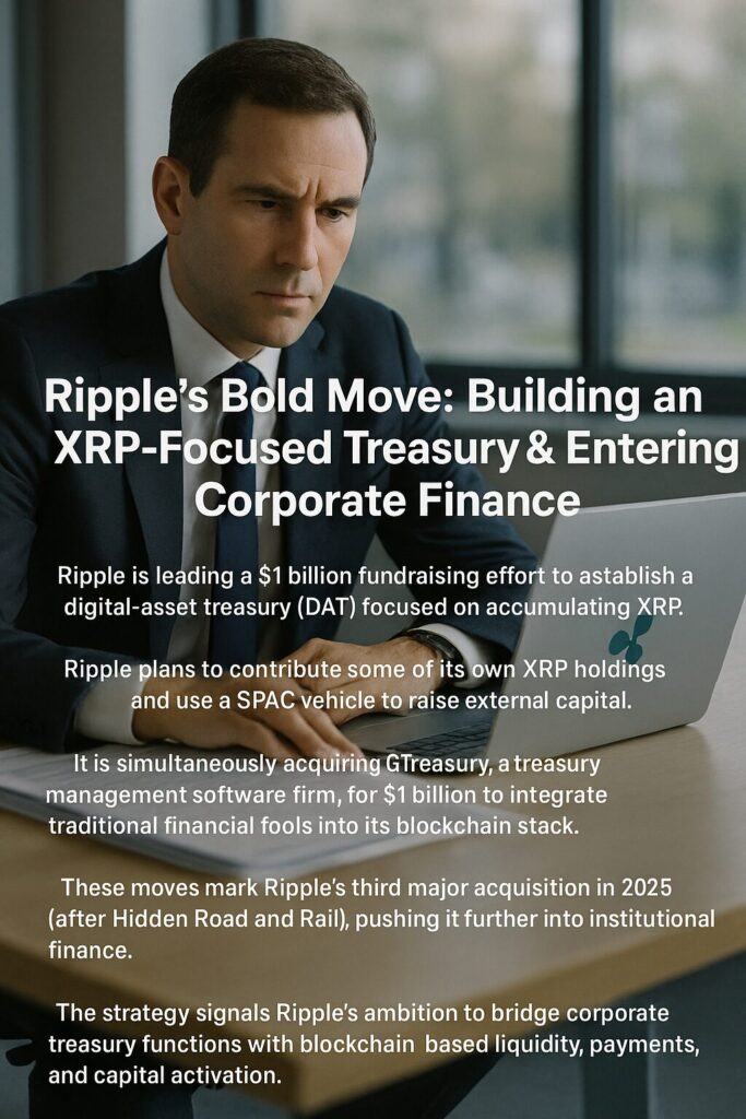 Ripple’s recently announced moves — leading a $1 billion fundraising to build a new XRP-centric treasury (DAT) and acquiring GTreasury for $1 billion — represent a bold pivot into bridging the worlds of corporate treasury and on-chain capital. These steps, alongside earlier acquisitions like Hidden Road and Rail, outline a vision of Ripple as a full-stack institutional infrastructure provider, not just a payments or blockchain protocol player.