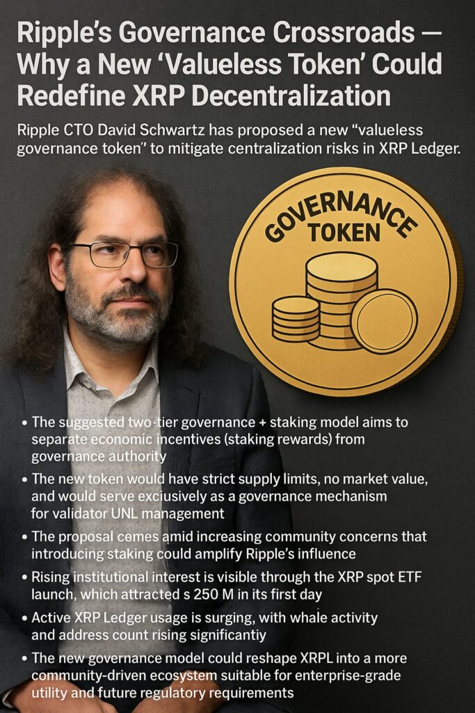 In late 2025, Ripple CTO David Schwartz—the chief architect behind much of the XRP Ledger’s core logic—introduced a bold governance proposal that could reshape the future of XRPL. His suggestion: a new governance token, intentionally made economically worthless, designed purely to decentralize network oversight and reduce Ripple’s own influence.