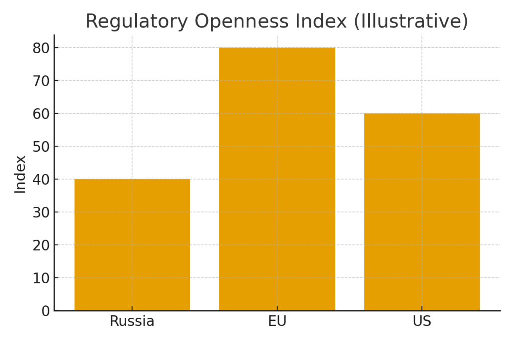 This graph illustrates an “Regulatory Openness Index” (illustrative), comparing Russia with the EU and U.S. to show relative accessibility.