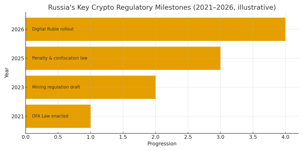 - Risk-heightened jurisdiction: Russia is increasing controls, confiscations, and enforcement. Engaging with unlicensed platforms or conducting peer-to-peer trading within Russia carries heightened legal risk.
