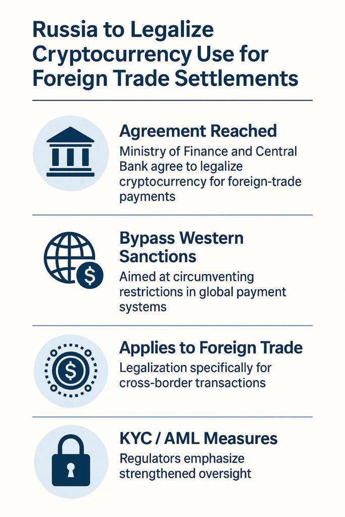 Over the past several years, Russia has progressively changed its stance on cryptocurrencies. Previously, domestic usage was heavily restricted. According to recent reports, on October 22 2025 the Ministry of Finance of the Russian Federation and the Central Bank of Russia agreed to legalise the use of digital assets for cross-border trade settlements. The decision follows an earlier “experimental legal regime” (ELR) introduced in September 2025 to pilot crypto usage in export and import transactions.