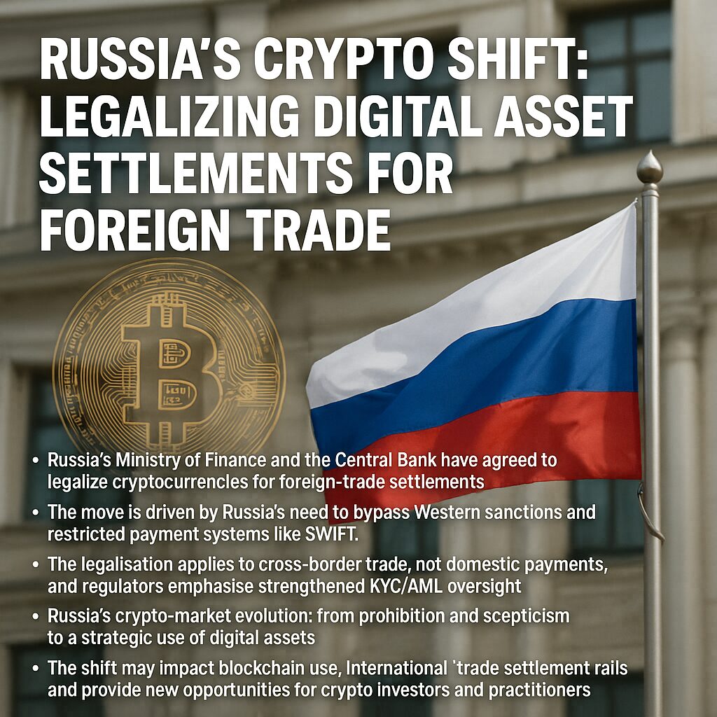 In summary, Russia’s decision to legalise cryptocurrency use for foreign-trade settlements represents a major strategic pivot — not just for Russia’s economy, but for how blockchain and digital-asset infrastructures may be used in international trade. For crypto investors and practitioners focused on new revenue sources and real-economy applications of blockchain, this shift underscores the importance of seeing crypto not only as speculative instruments but as evolving settlement rails, compliant infrastructures, and trade-finance enablers.