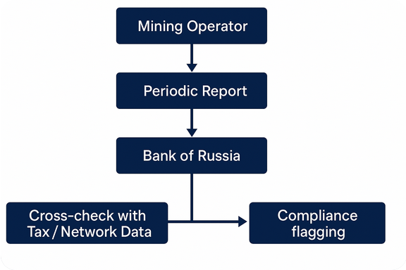 [Insert here a diagram or flow chart showing “Mining Operator → Periodic Report → Bank of Russia → Cross-check with Tax / Network Data → Compliance flagging”]