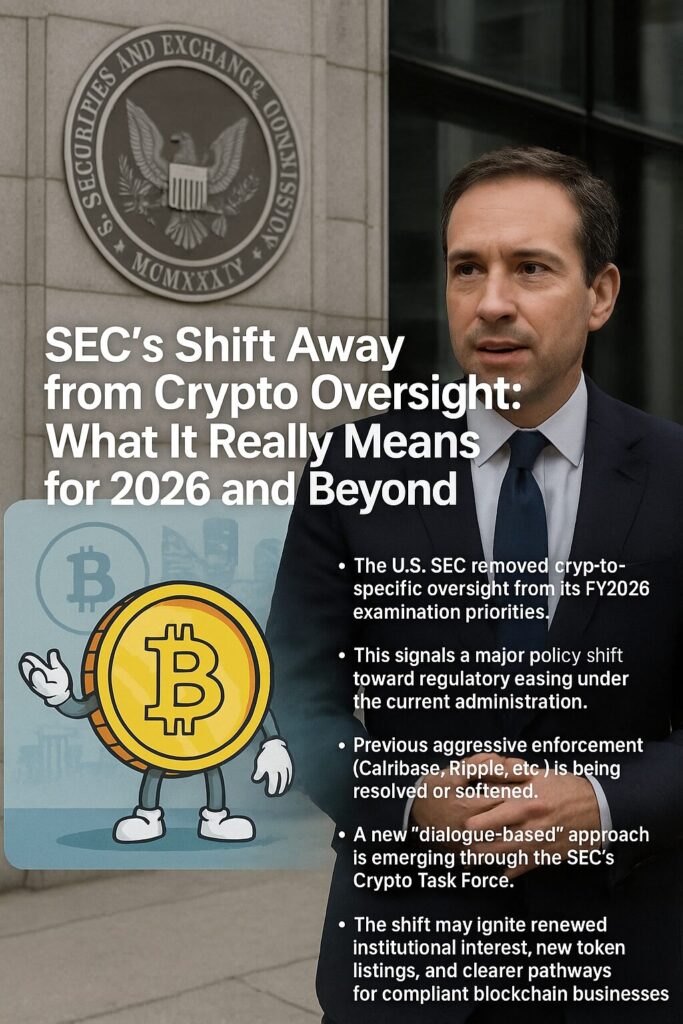 - The U.S. SEC removed crypto-specific oversight from its FY2026 examination priorities.