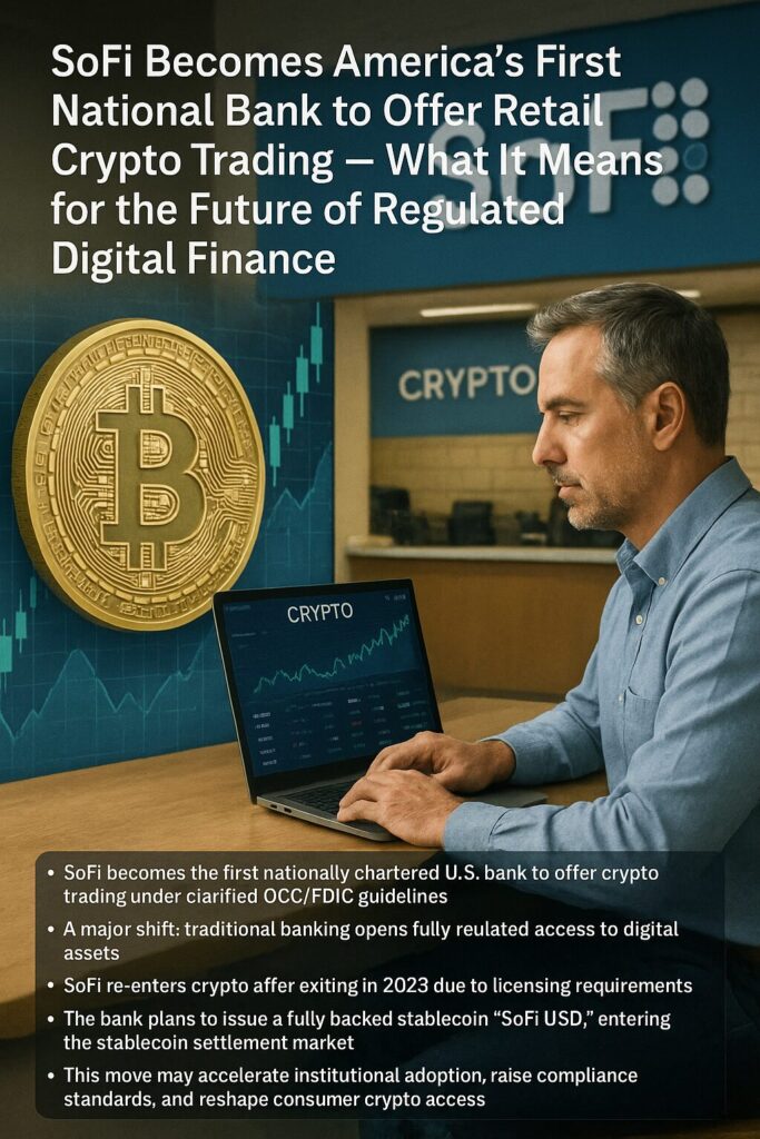 In November 2025, SoFi Technologies, a U.S.-based fintech and nationally chartered bank, officially became the first national bank in American history to provide retail cryptocurrency trading under the clarified guidelines issued by the Office of the Comptroller of the Currency (OCC) and the Federal Deposit Insurance Corporation (FDIC). This milestone marks a major shift in the relationship between regulated banking and digital assets, representing a new era where crypto is no longer confined to exchanges, neobanks, or unregulated platforms. Instead, it is now embedded directly within the core infrastructure of U.S. financial institutions.