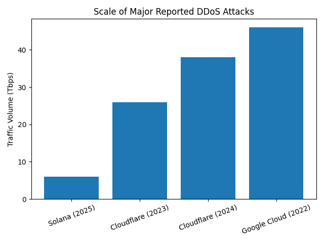 • Solana has reportedly endured sustained large-scale DDoS attacks peaking near 6 Tbps without observable disruption to block production or transaction finality.