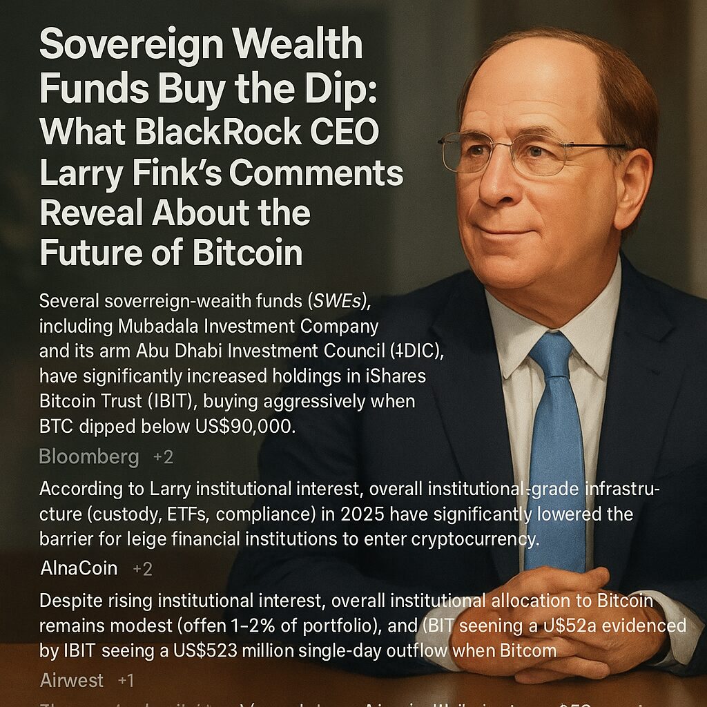In a recent public statement at the DealBook Summit on December 3, 2025, BlackRock’s CEO Larry Fink highlighted a remarkable shift in the behavior of sovereign-wealth funds. According to Fink, several state-backed funds had stepped in to buy Bitcoin — not as speculative trades, but as long-term positions. He stated that these funds had purchased Bitcoin when its price fell below US$120,000, US$100,000 and even around US$80,000 — essentially “buying the dip.” This is a departure from the common narrative that sovereign funds, being conservative by nature, would avoid highly volatile assets like cryptocurrencies.