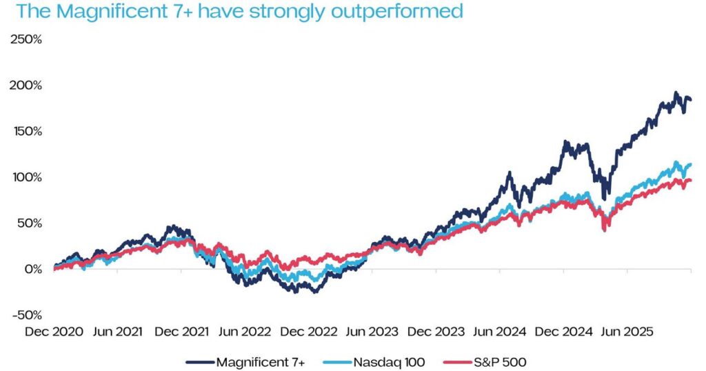The recent rally has not been evenly distributed across the market. Instead, it has been overwhelmingly driven by the so-called “Magnificent Seven”: