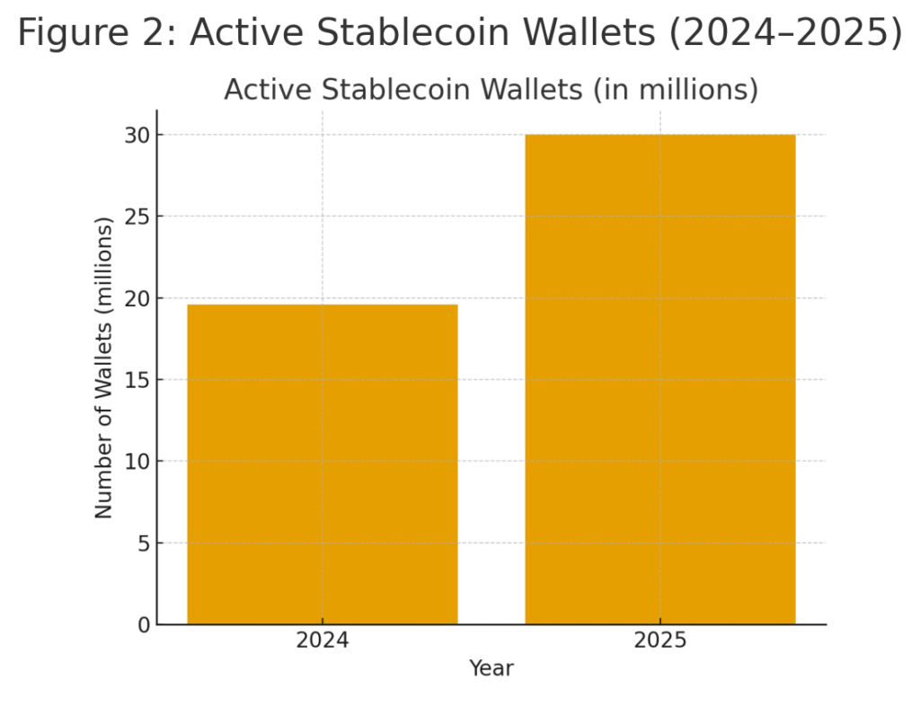- A study shows that active stablecoin wallet addresses increased from 19.6 million (Feb 2024) to over 30 million (Feb 2025) — a +53 % year-on-year growth.