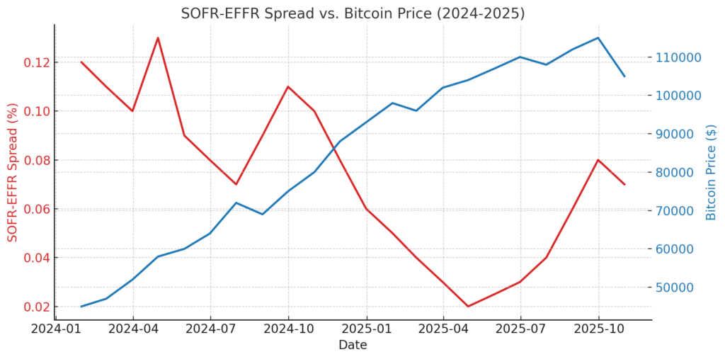 - SOFR-EFFR Spread: The gap between secured (SOFR) and unsecured (EFFR) overnight funding rates. When the spread narrows, funding stress eases; when it widens, liquidity tightens.