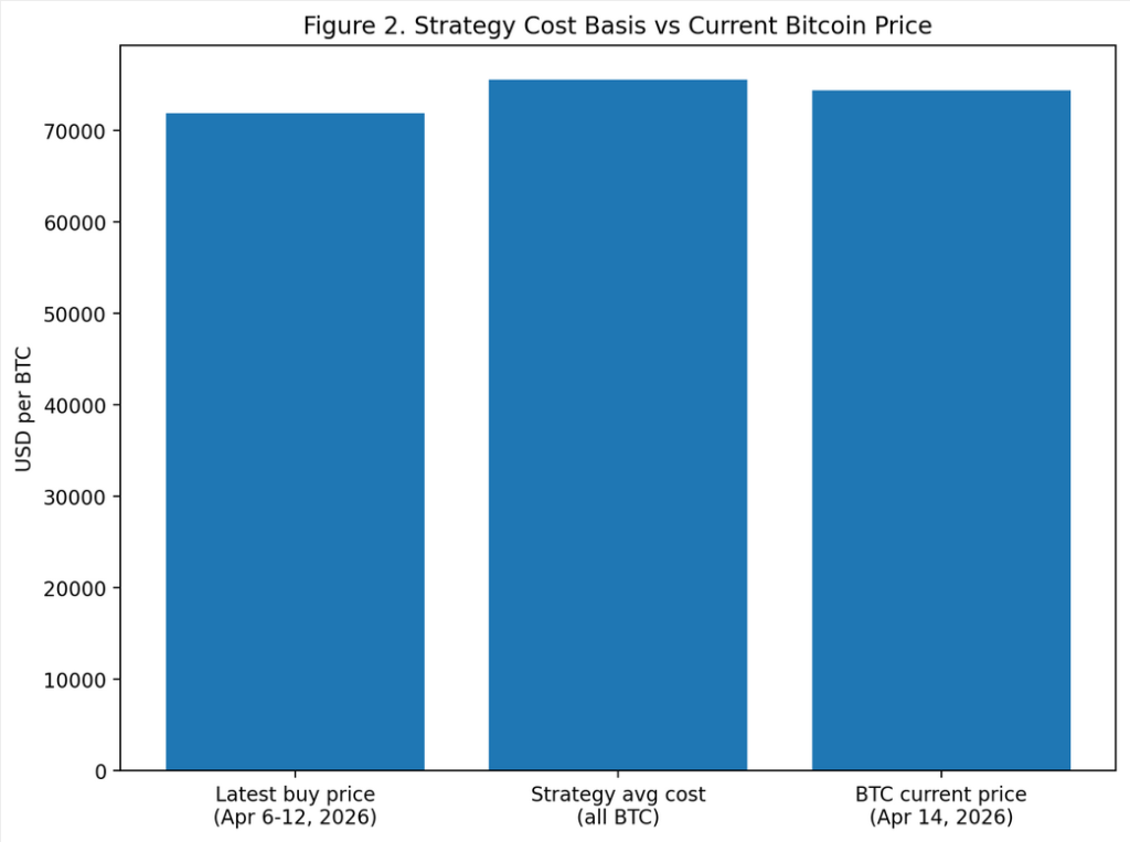 The latest market recovery has narrowed some of that gap. Strategy’s own BTC metrics page showed Bitcoin around $72,203 when its dashboard was last updated on April 13, while the real-time finance quote now places BTC higher, at roughly $74,431. That rebound illustrates why Strategy continues buying into weakness: the firm is not trading around short-term fear, but averaging into a long-duration conviction position.