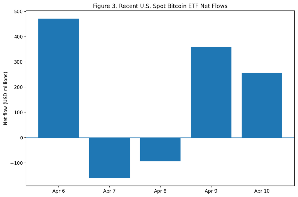At the same time, ETF data shows that institutional participation remains active rather than absent. Farside’s recent U.S. spot Bitcoin ETF flow data shows a strong net inflow of $471.4 million on April 6, followed by outflows on April 7 and April 8, and then a renewed positive turn with $358.1 million on April 9 and $256.7 million on April 10. That pattern does not suggest one-way euphoria, but it does show that deep pools of capital are still engaging with Bitcoin around this price zone.