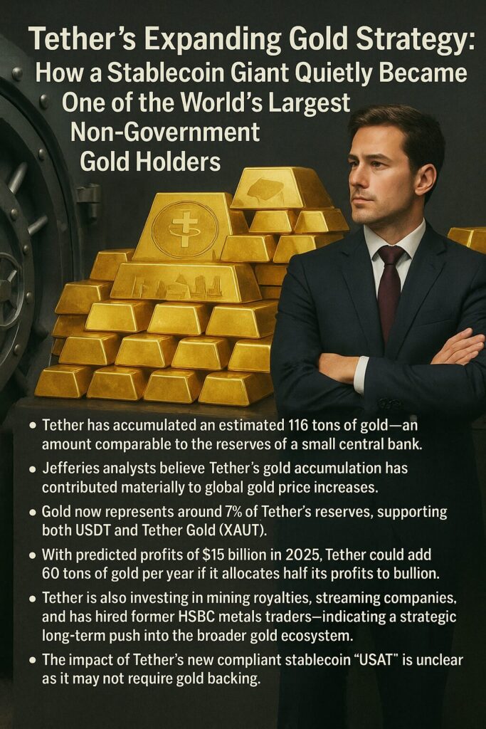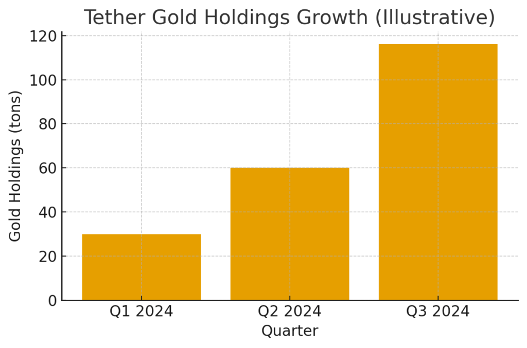 - Tether has accumulated an estimated 116 tons of gold—an amount comparable to the reserves of a small central bank.