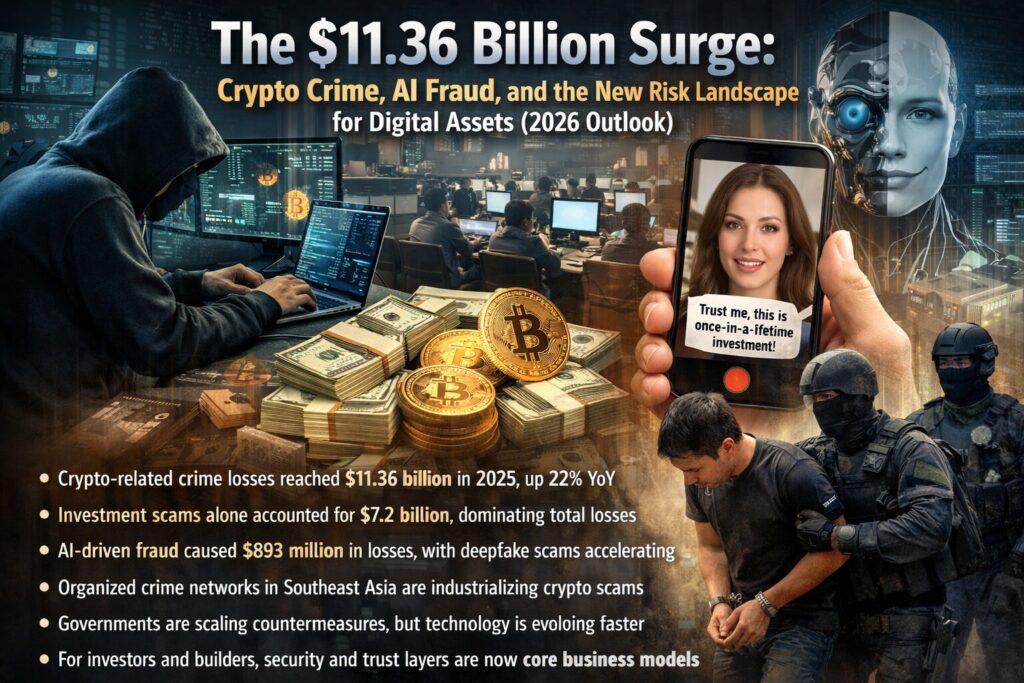 - Crypto-related crime losses reached $11.36 billion in 2025, up 22% YoY