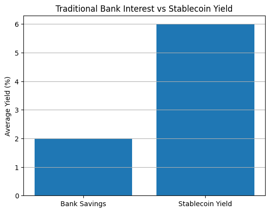 A comparison chart showing average bank savings interest rates (around 1–3%) versus stablecoin yields (often 4–8% depending on platform).