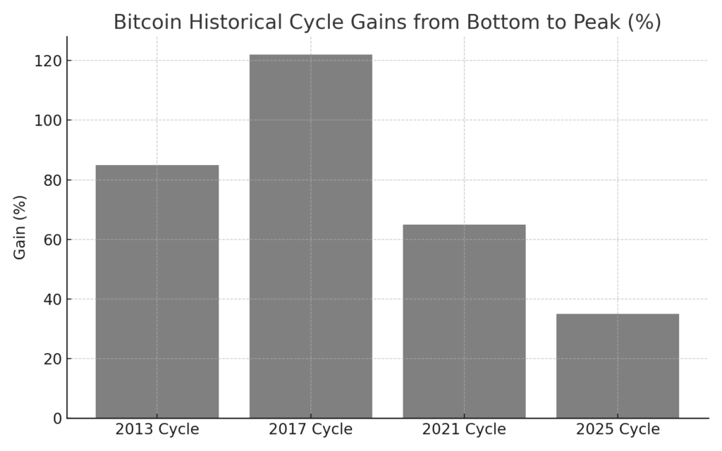 Caption: Bitcoin’s historical cycle comparisons, showing the climb factor from prior lows to peaks.
