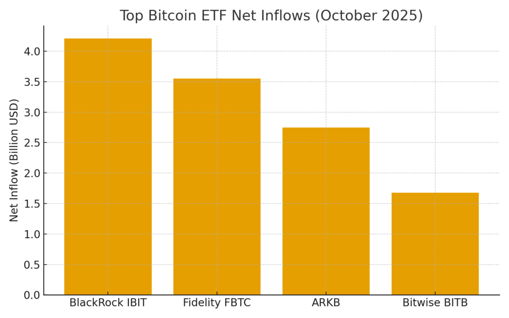 • BlackRock’s IBIT (a Bitcoin ETF) has stood out, reportedly acting as a “shock absorber” mopping up sell-side pressure and not posting any net outflows in October so far, with $4.21 billion net inflow.
