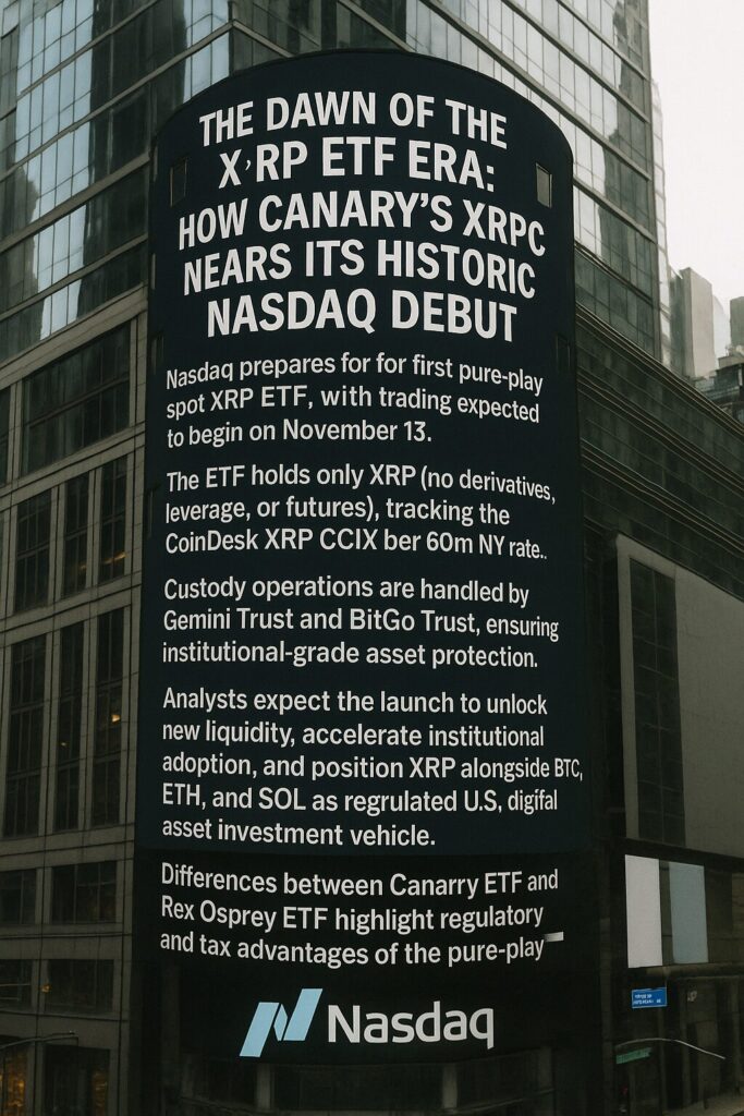 - Nasdaq prepares for the first pure-play spot XRP ETF (XRPC), with trading expected to begin on November 13.