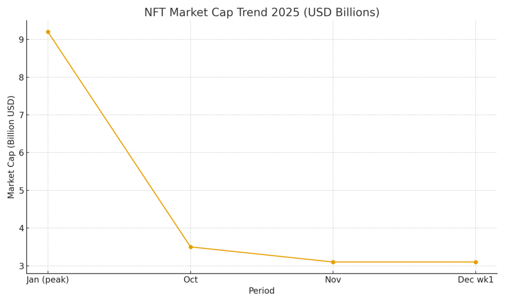 - NFT monthly sales fell to their lowest level in 2025, dropping nearly 50% from October to November.