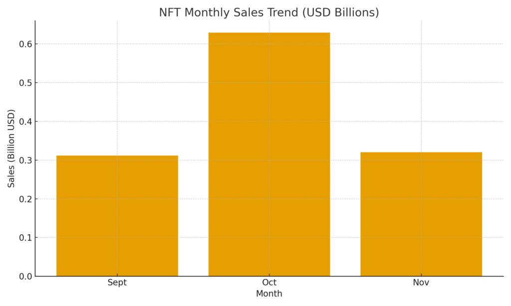 According to CryptoSlam, global NFT sales for November reached $320 million, a sharp contraction from October’s $629 million, marking nearly a 50% drop month-over-month.