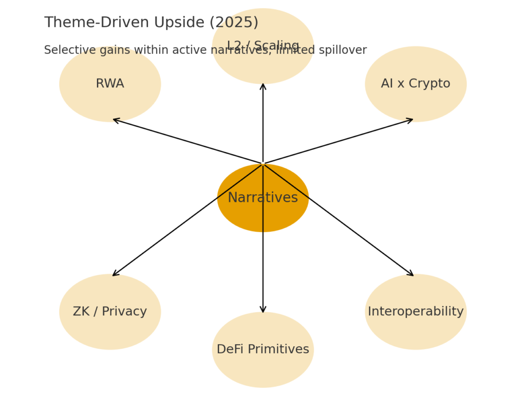 - Broad altcoin rallies (“alt seasons”) may no longer occur — only theme-driven sectors may see upside.