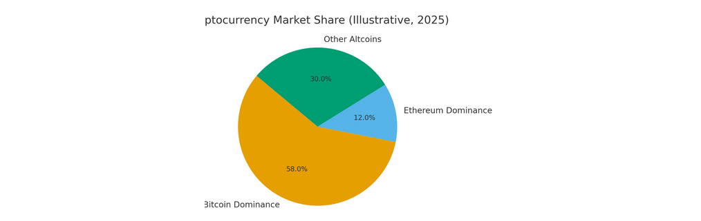 In the broader landscape, Bitcoin’s market share (dominance) is still substantial. At one point, it peaked at 65% over the past year, though it has dipped to ~58% more recently. Meanwhile, Ethereum’s share recovered from a low of ~7.3% (in April) to about 12% now.