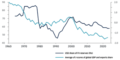 Dollar dominance has already declined from over 70% of global reserves in the early 2000s to around 58%–59% in recent years (converted to $ values).