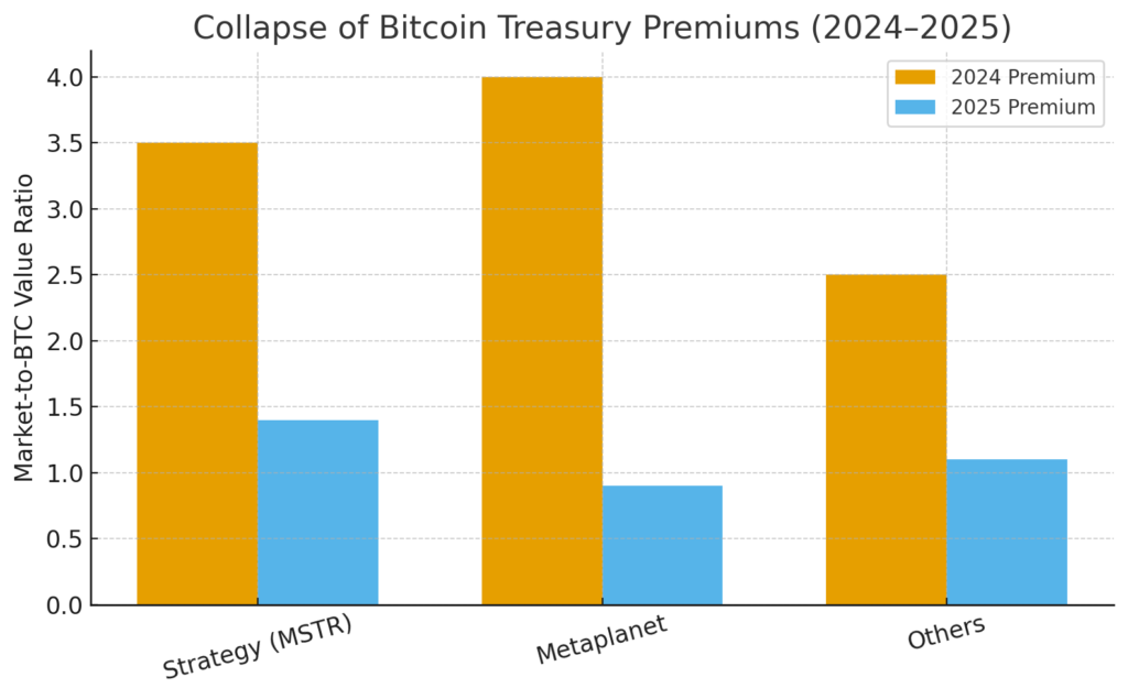 - In some cases, market value of the firm fell below the Bitcoin value held — e.g., Metaplanet’s market cap fell to about US $3.1 billion while its BTC holdings rose to around US $3.3 billion, yielding an mNAV (market-to-Bitcoin holdings) ratio of ~0.99.