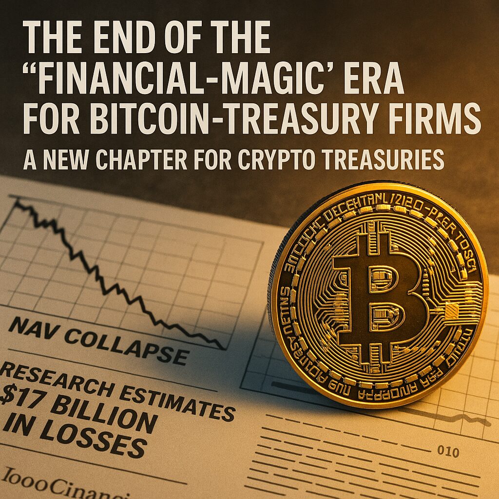 - Public companies holding cryptocurrency treasuries (so-called “Bitcoin treasury firms”) have seen their Net Asset Values (NAVs) collapse, wiping out premiums once paid by investors.