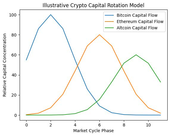 The chart illustrates how capital historically flows from Bitcoin into Ethereum and then into smaller altcoins as market confidence increases.