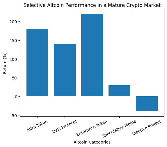 The chart illustrates how different categories of tokens may experience dramatically different returns in a more mature crypto market.