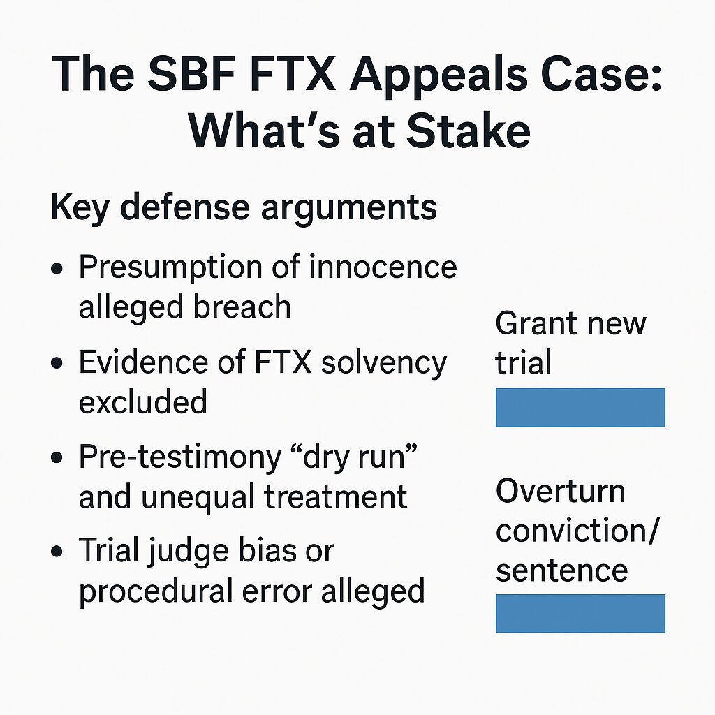 If the appeal is affirmed, it may increase risk-perception across the crypto market—especially for exchanges, lending platforms, yield aggregators, and algorithmic stablecoins. Conversely, if there is a surprise reversal or significant legal nuance favouring SBF, one might see short-term sentiment relief—but likely accompanied by regulatory clarifications.