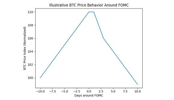 This conceptual chart shows how Bitcoin prices often stabilize before the FOMC, followed by increased volatility and adjustment after the event. The chart is normalized for structural illustration and does not represent exact historical prices.