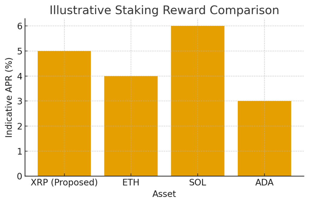 Institutional investors increasingly seek regulated yield opportunities, especially in the U.S., Japan, and Singapore. If XRP introduces a compliant staking model, demand from ETFs, corporate treasuries, and liquidity providers could grow.Illustrative Chart: Potential Staking APR Comparison