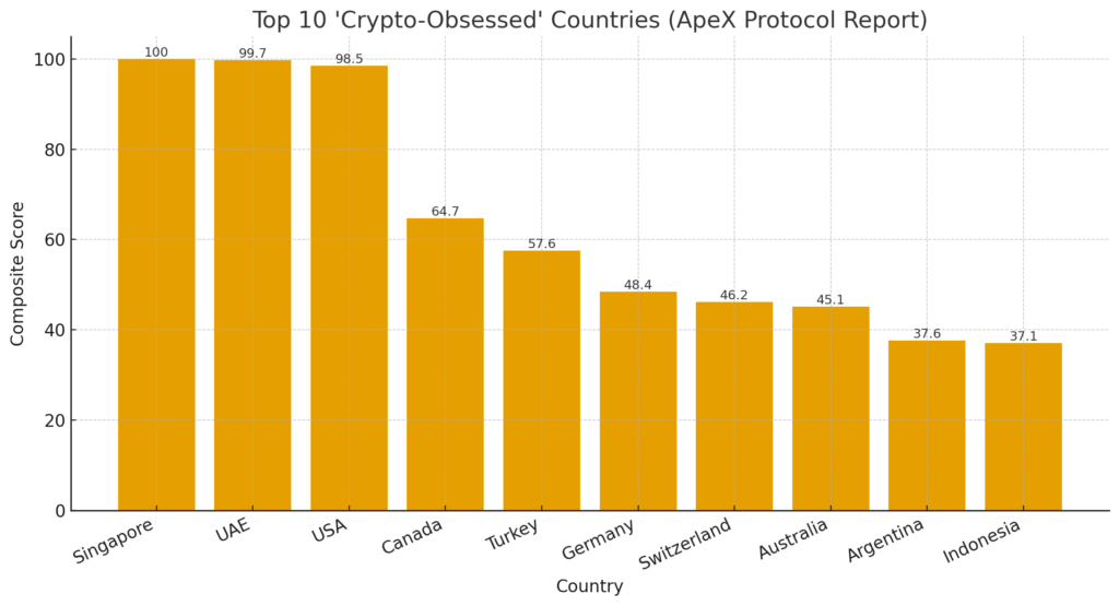 In a recent report by ApeX Protocol, Singapore and the United Arab Emirates (UAE) have been ranked as the world’s most “crypto-obsessed” countries. The index evaluates four major dimensions: ownership rate (percentage of population holding crypto), adoption growth over recent years, search activity per capita, and crypto ATM / infrastructure presence.