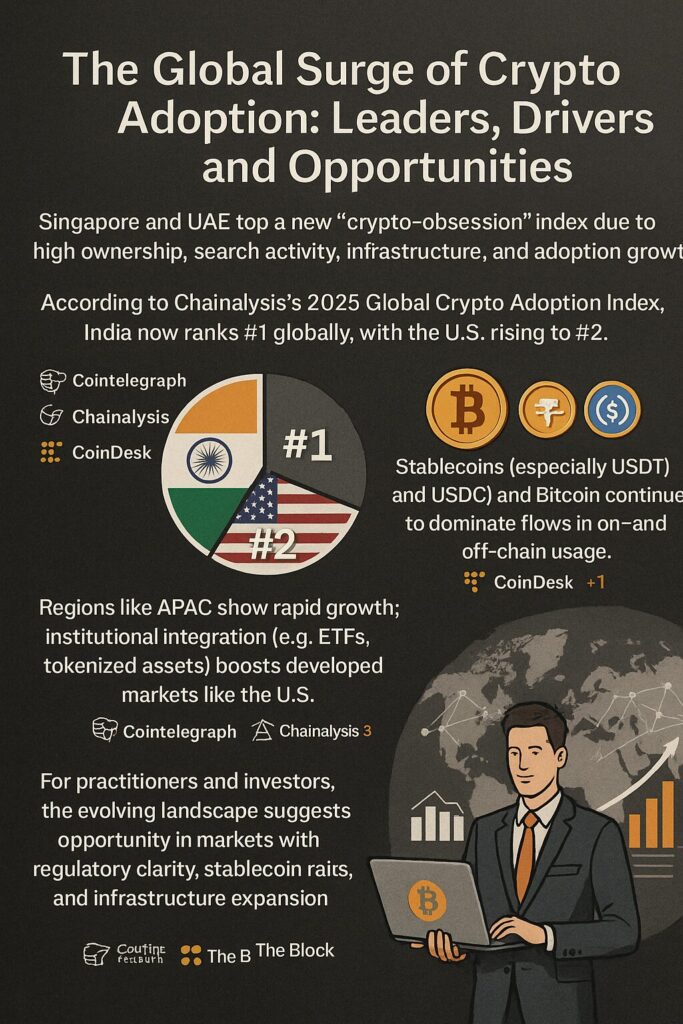 The latest reports from ApeX Protocol and Chainalysis confirm that the world has entered a new phase of crypto adoption—one where not just speculative investors, but entire populations and financial systems are participating. Singapore and the UAE maintenant lead in “obsessive” engagement, thanks to clarity and infrastructure, while India and the U.S. top global adoption when measured by transactional and institutional scale.