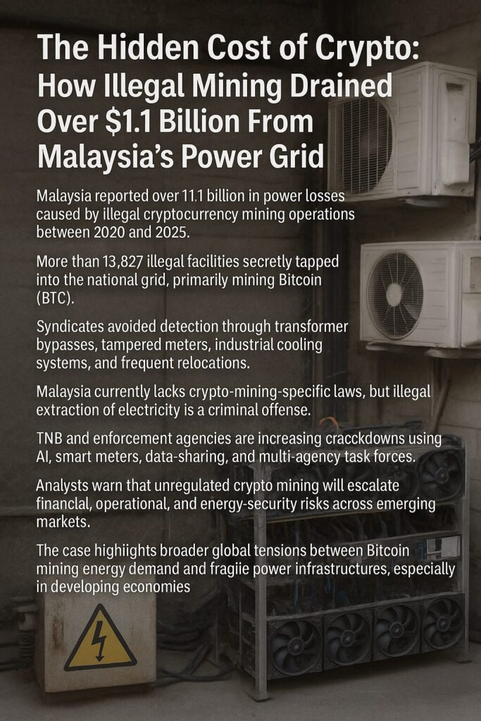 This article examines what happened in Malaysia, how illegal mining operations function, why the problem is spreading globally, and what it means for crypto investors, miners, utilities, and policymakers.
