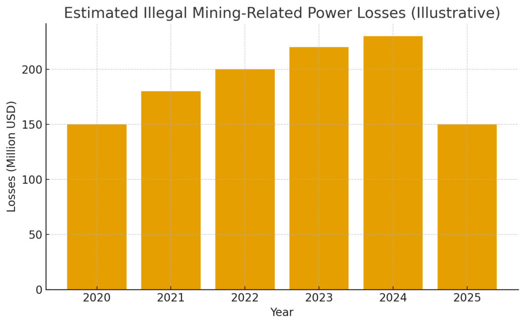 From 2020 to August 2025, 13,827 illegal mining operations were identified as having siphoned electricity directly from the grid. These operations, mostly running Bitcoin miners (ASICs), consumed industrial-level power without paying for it, creating severe national-scale losses.