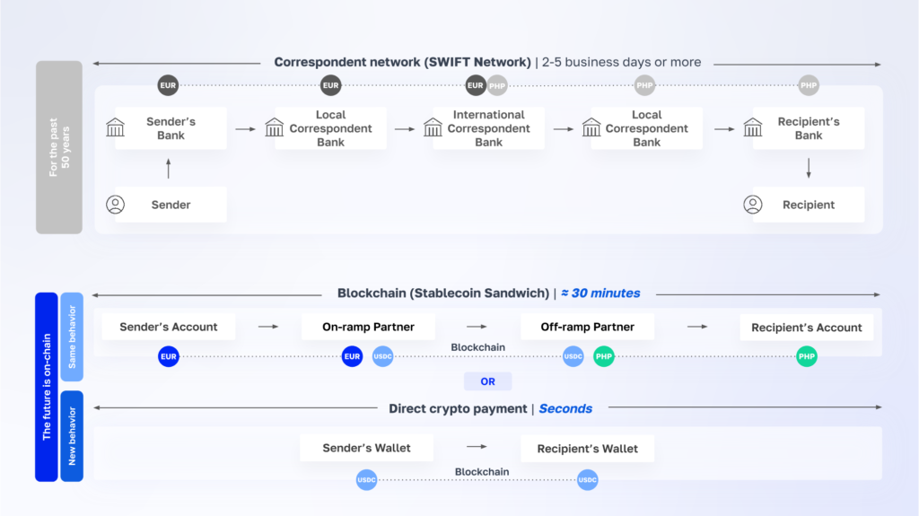 Historically, international transfers moved through correspondent banking chains. Bank A sends to Bank B via intermediary Bank C; each step extracts fees, imposes compliance checks, and adds settlement delay. A transfer of $100,000 could incur cumulative costs and take multiple business days.
