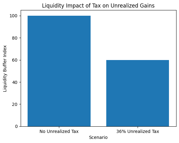 Imagine a crypto investor holding $500,000 in Bitcoin that appreciates to $800,000 during a bull cycle. A 36% tax on the $300,000 unrealized gain would require $108,000 in tax—even if no coins were sold.