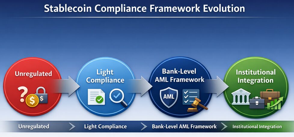 (Create an image showing transition: “Unregulated → Light Compliance → Bank-Level AML Framework → Institutional Integration” with arrows indicating progression.)