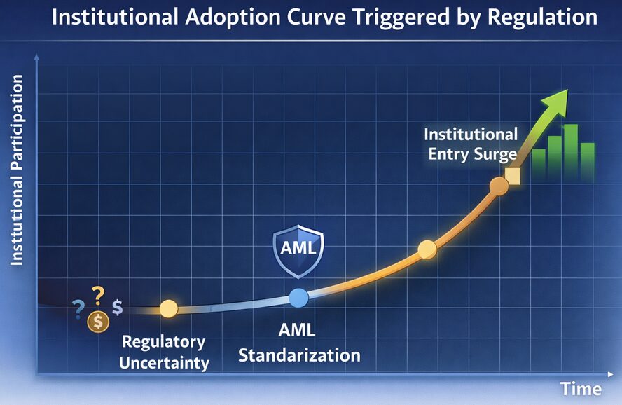 (Graph showing X-axis: Time, Y-axis: Institutional Participation. Mark key points: “Regulatory Uncertainty,” “AML Standardization,” “Institutional Entry Surge.”)
