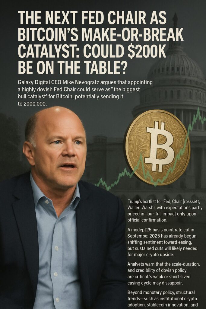 In a recent interview, Galaxy Digital CEO Mike Novogratz painted a bold scenario: if the next U.S. Federal Reserve Chair tilts strongly dovish—i.e., pursuing aggressive rate cuts even when inflation pressures remain—Bitcoin could soar to $200,000 under the right conditions. He dubbed the Fed Chair decision as “the biggest bull catalyst for Bitcoin and the rest of crypto.”