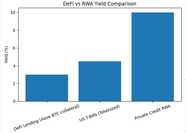 Consider a practical comparison: lending Bitcoin as collateral on platforms like Aave typically yields around 3%. This is roughly comparable—or even inferior—to tokenized U.S. Treasury bills, which offer similar liquidity with lower risk.